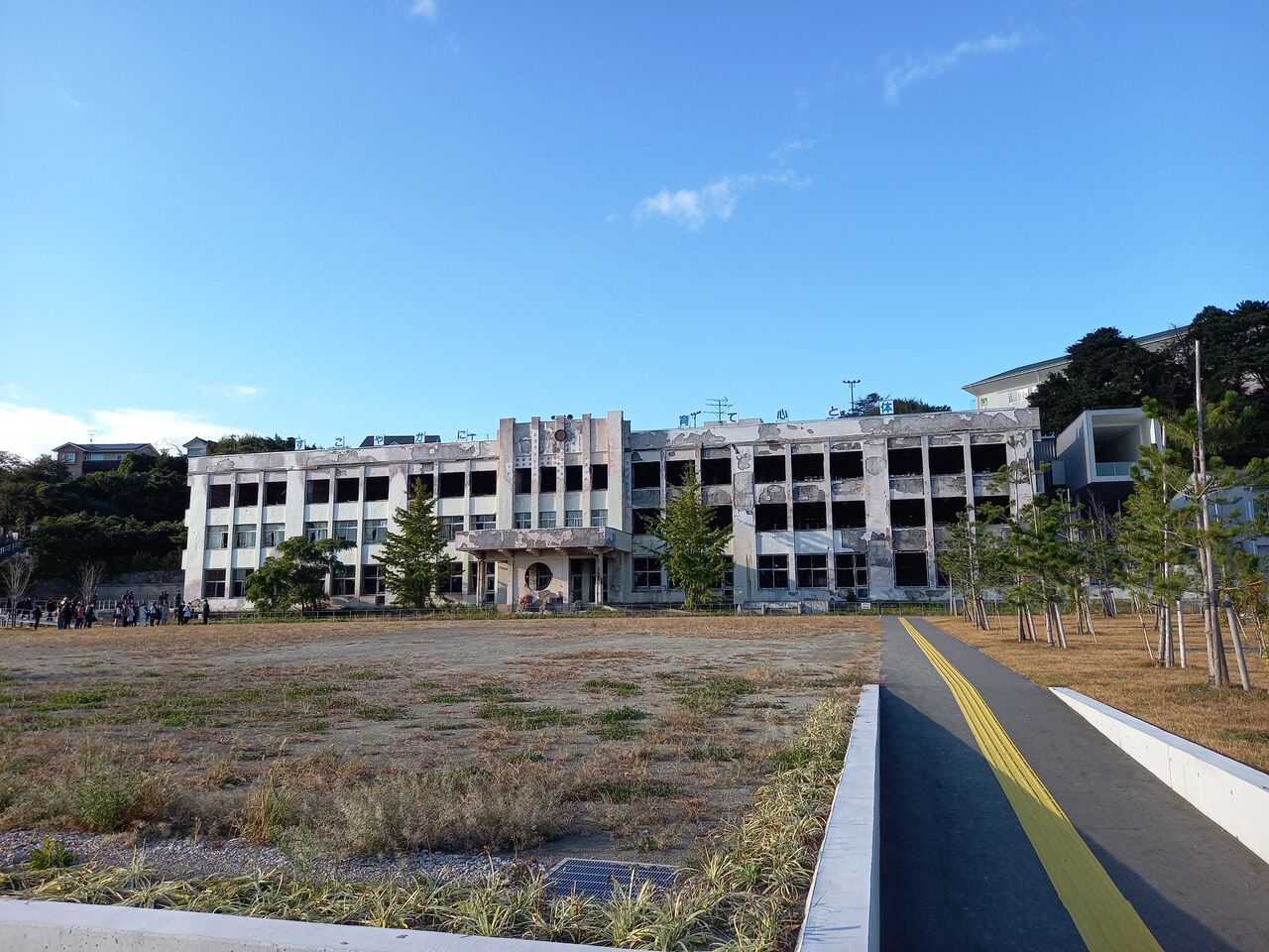 向かいには震災遺構「門脇小学校」。火災に遭った小学校です。遠くから眺めるだけになってしまいましたが、住宅街の中に当時の姿をそのまま残す学校の存在感は計り知れないものでした。
